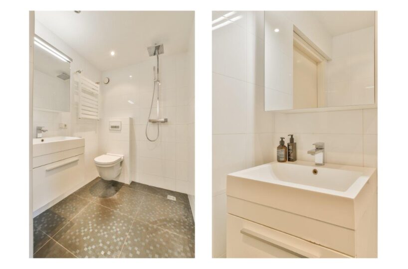 Next to the door from the hallway to the lounge is the bathroom. It has a wash basin and a mirror cabinet with shelves for toiletries above. A toilet and shower complete the amenities.